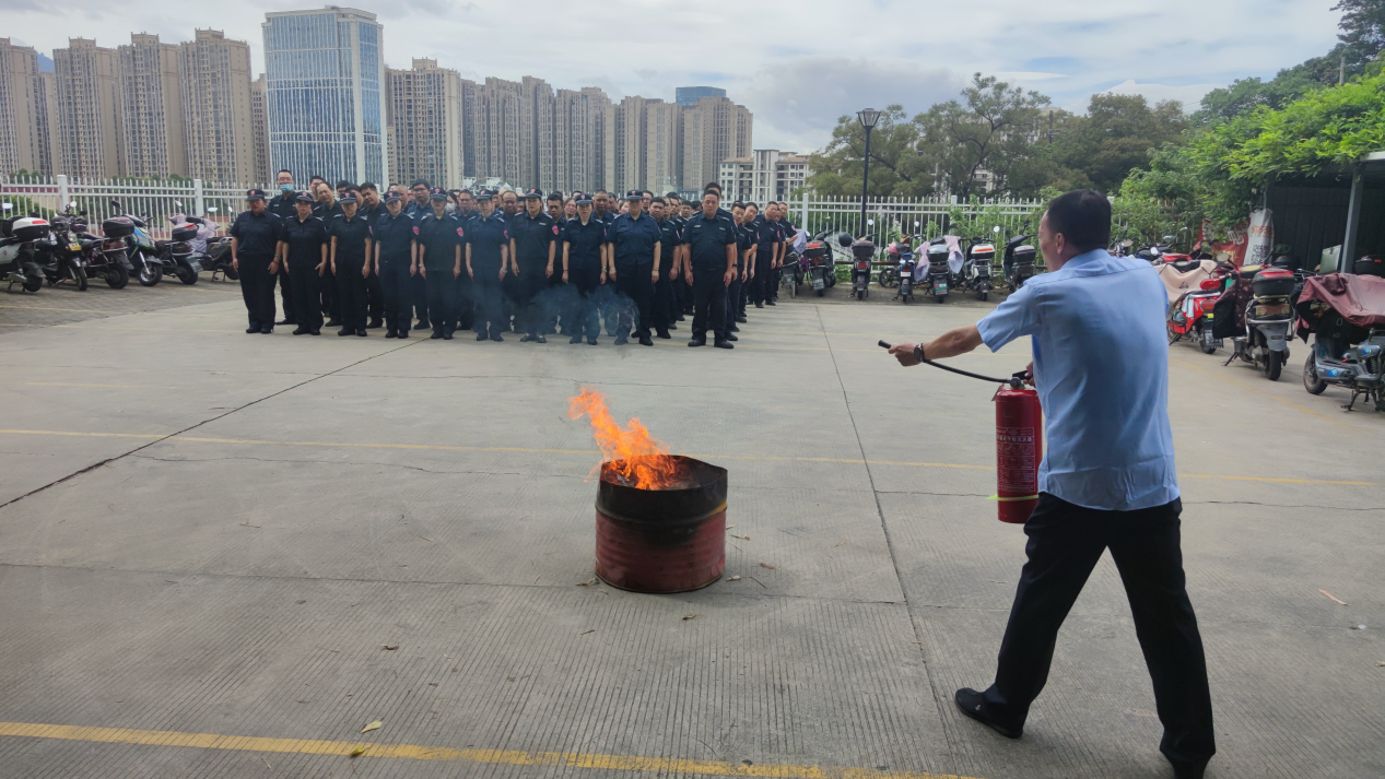演练开始前,福州保安公司副总经理邓文鑫向全体参与演练的人员做消防安全宣导,强调安全生产要常抓不懈、警钟长鸣,牢固树立“安全责任重于泰山”的思想。本次演练模拟突遇火灾发生时如何使用干粉灭火器扑灭初起火源,在现场讲解并演示了消防器材的使用方法后,参训人员逐一使用灭火器对模拟火源进行喷射、扑灭,扎实做到在理论上丰富消防知识储备,在实操中磨炼应急处置能力。