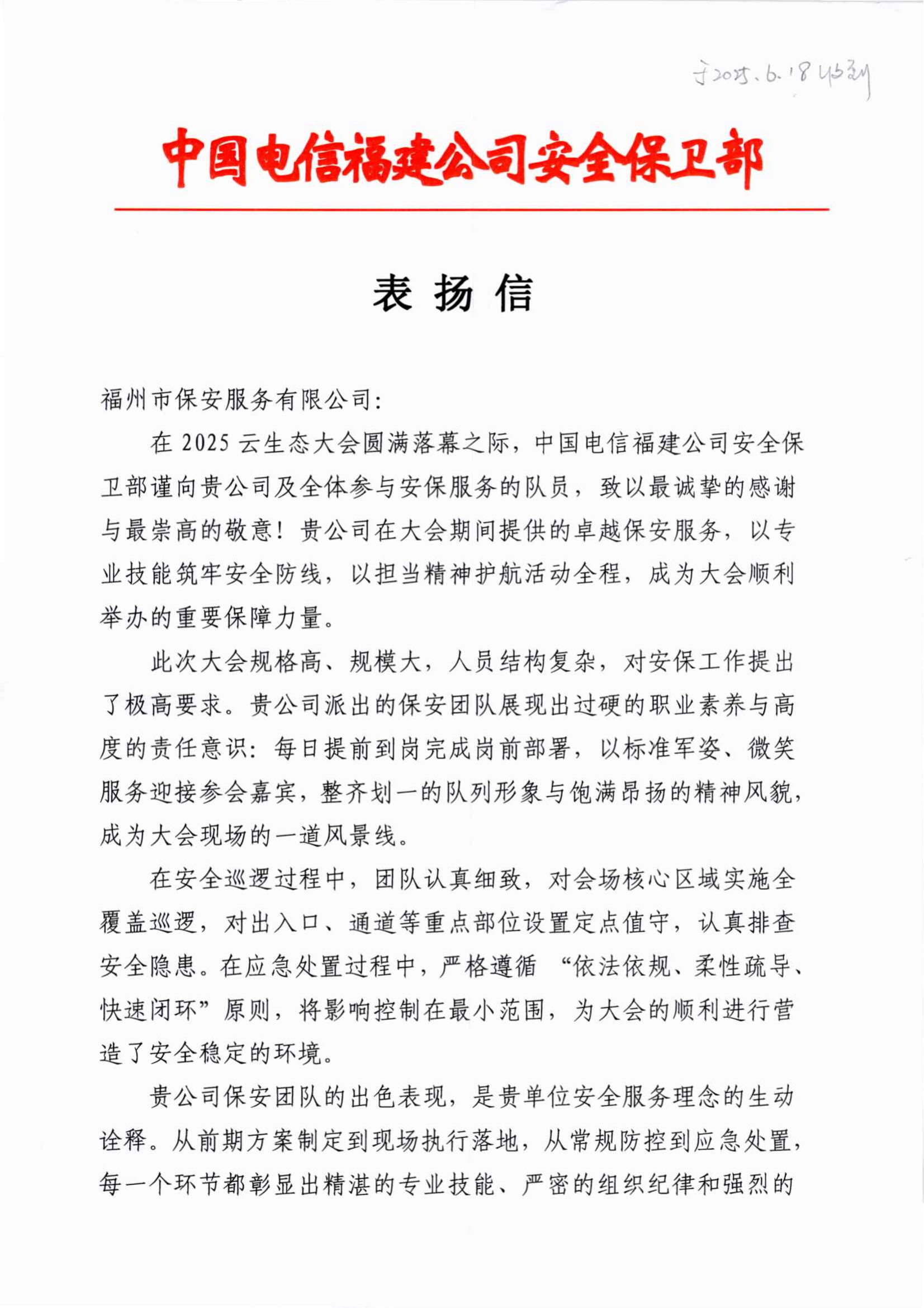 6月18日,福州市保安服务有限公司(下文简称“福州保安公司”)收到来自中国电信福建分公司的表扬信,对福州保安公司在2025生态大会中卓越保安服务表示衷心的感谢和肯定。